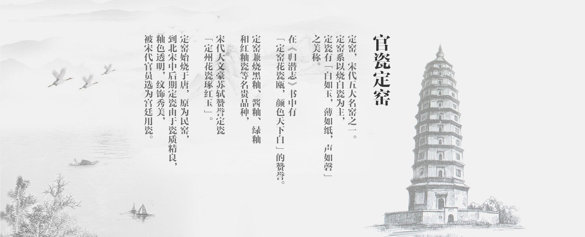 定窯為宋代五大名窯之一,窯址在今河北省曲陽澗滋村、野北村及東西燕村,在宋代屬定州,故名。創燒于唐,極盛于北宋及金,終于元。以產白瓷著稱,兼燒黑釉、醬釉和釉瓷,文獻分別稱其為“黑定”、“紫定”和“綠定”。